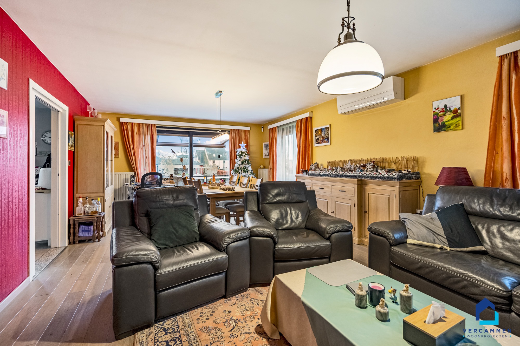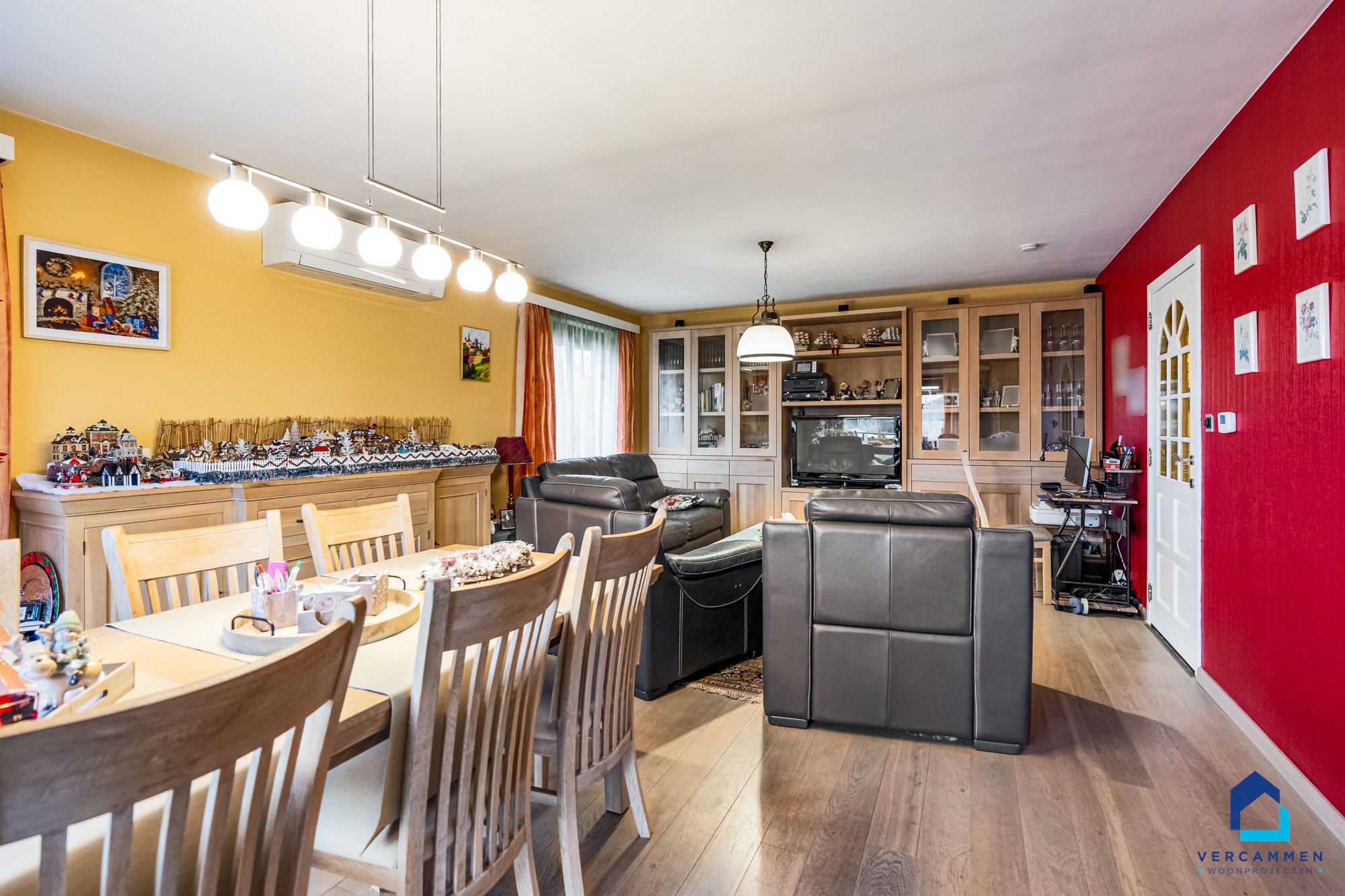 Via de inrit bereiken we aan de zijkant van de woning de inkomdeur, die ons verwelkomt in een ruime hal. Deze hal geeft toegang tot de sfeervolle woonkamer, die bovendien is uitgerust met airco. De open indeling verbindt de woonkamer met de eetruimte, waar de grote glaspartij zorgt voor zicht op de tuin.